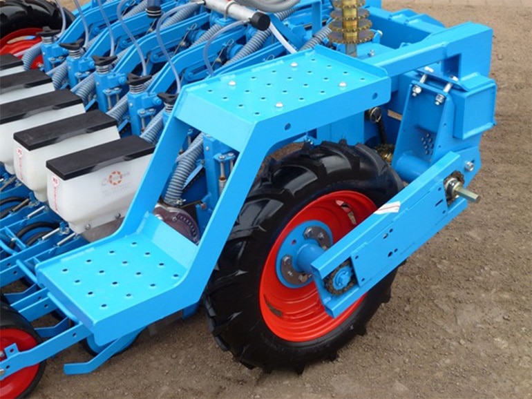 All wheels run in a sturdy “fork type” frame that supports them from both sides. The front wheel that guides the planter unit is always a wheel with a flexible non inflated rubber tyre. The intermediate press wheels can either have a rubber tyre or a stainless steel lining according to the customer’s preference.